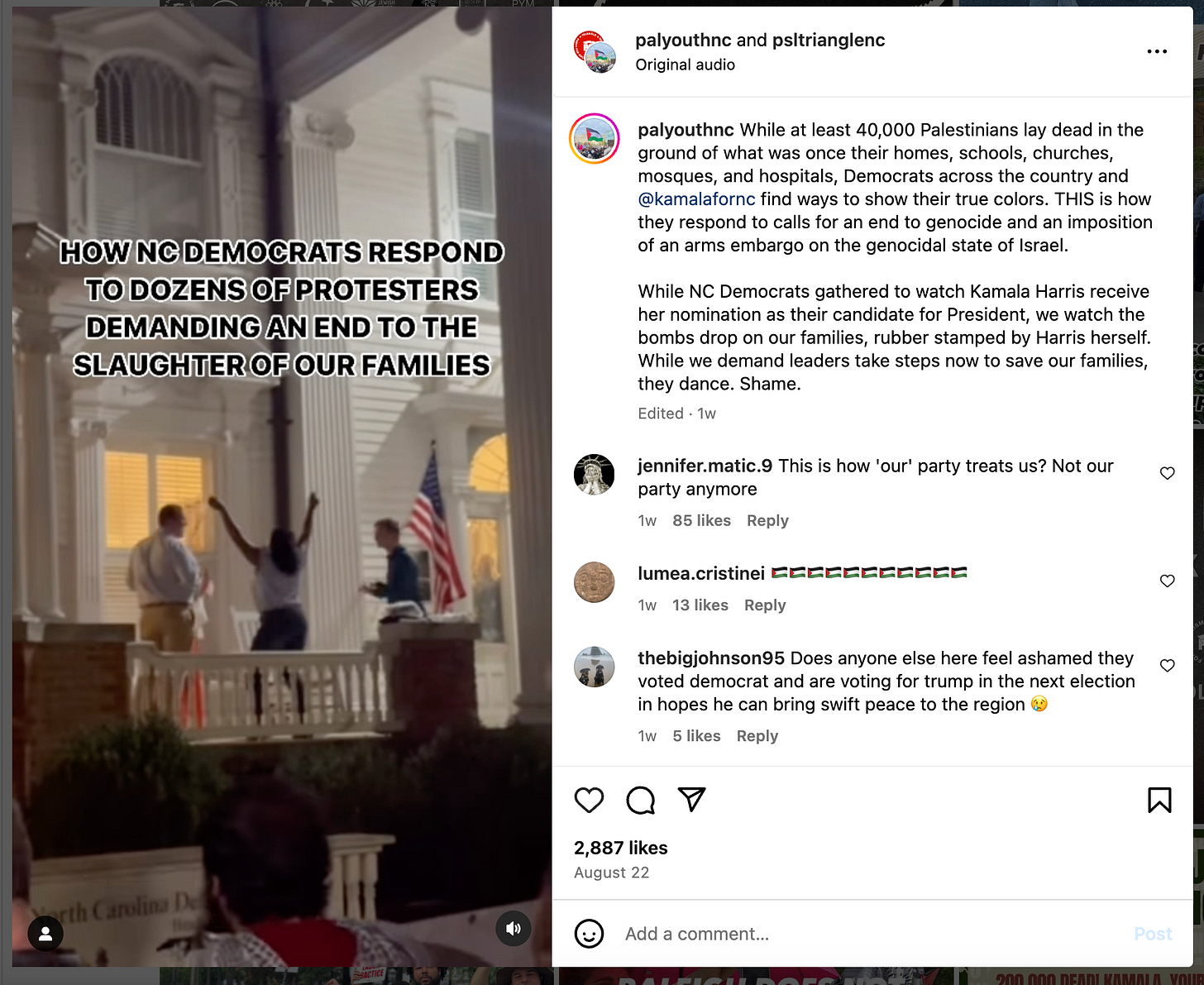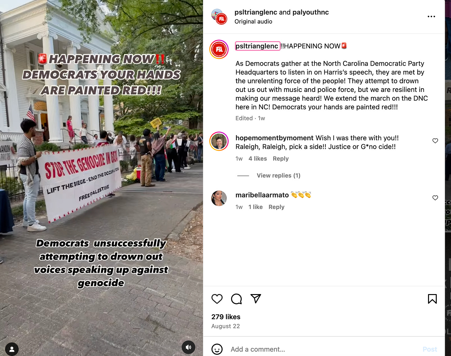 After posting previews for this story today, the Triangle Party of Socialism and Liberation is no longer tagged in the Instagram post advertising the “Abandon Harris” press conference.