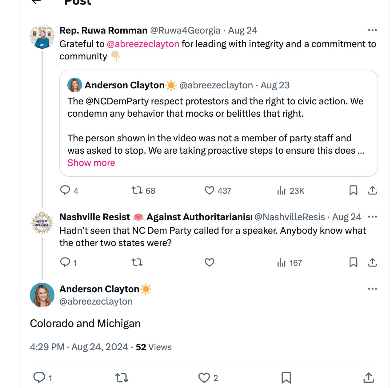 Clayton also supported an anti-Harris/Walz protest aimed at North Carolina Democrats during a convention watch celebration at the Party’s headquarters.