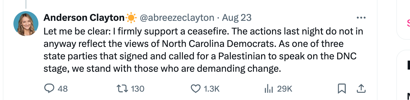 North Carolina's Democratic Party Chair, Anderson Clayton, strongly supports the campaign to take votes from the Walz/Harris ticket.